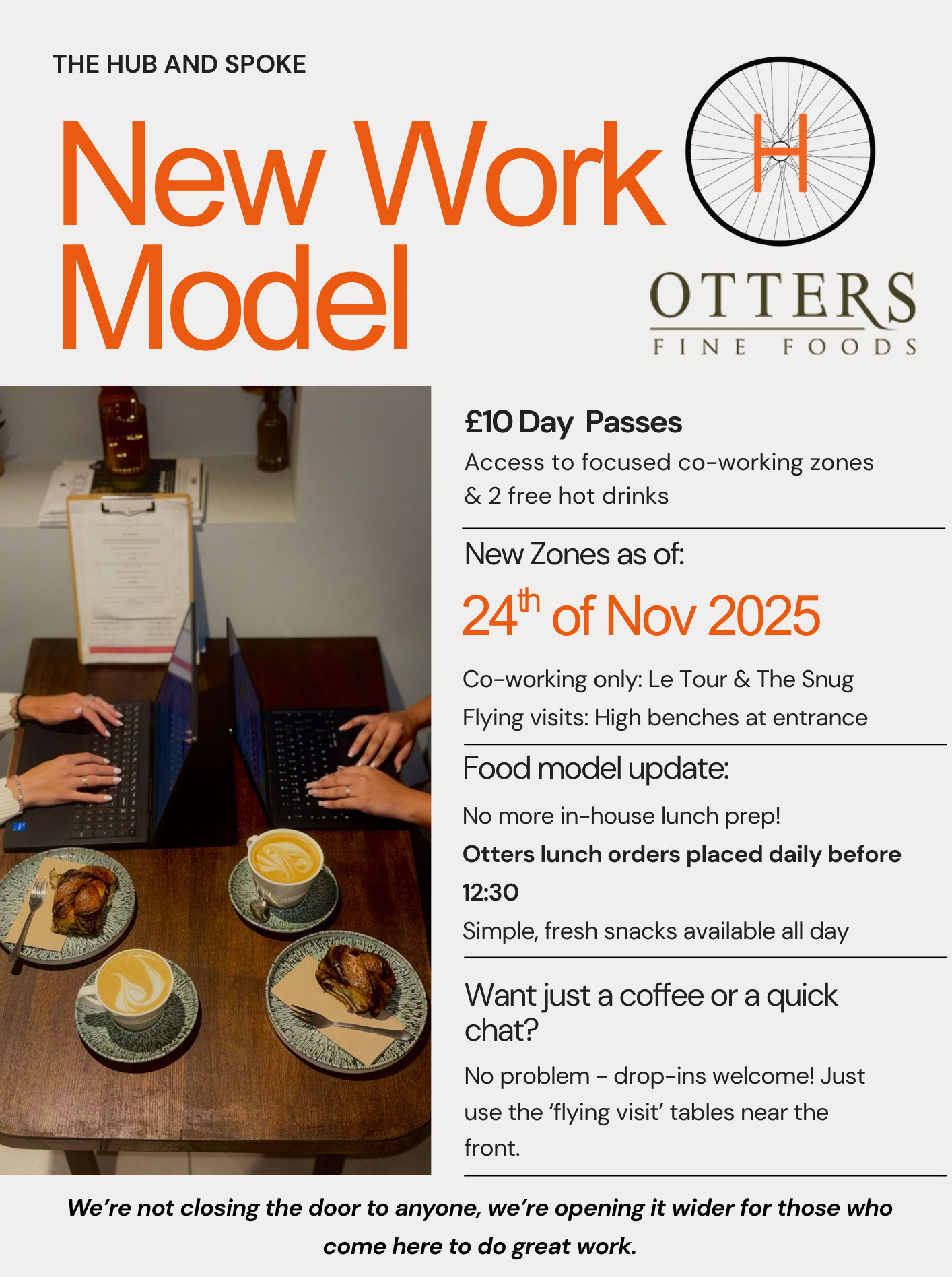 At The Hub and Spoke, our café isn’t just about coffee (though we take that very seriously). It’s a space designed around you, the way you work, connect and refuel. Whether you're joining us for a single day of focused productivity or making us your regular base, our updated café model offers everything you need to make the most of your workday with zero faff and plenty of flavour.